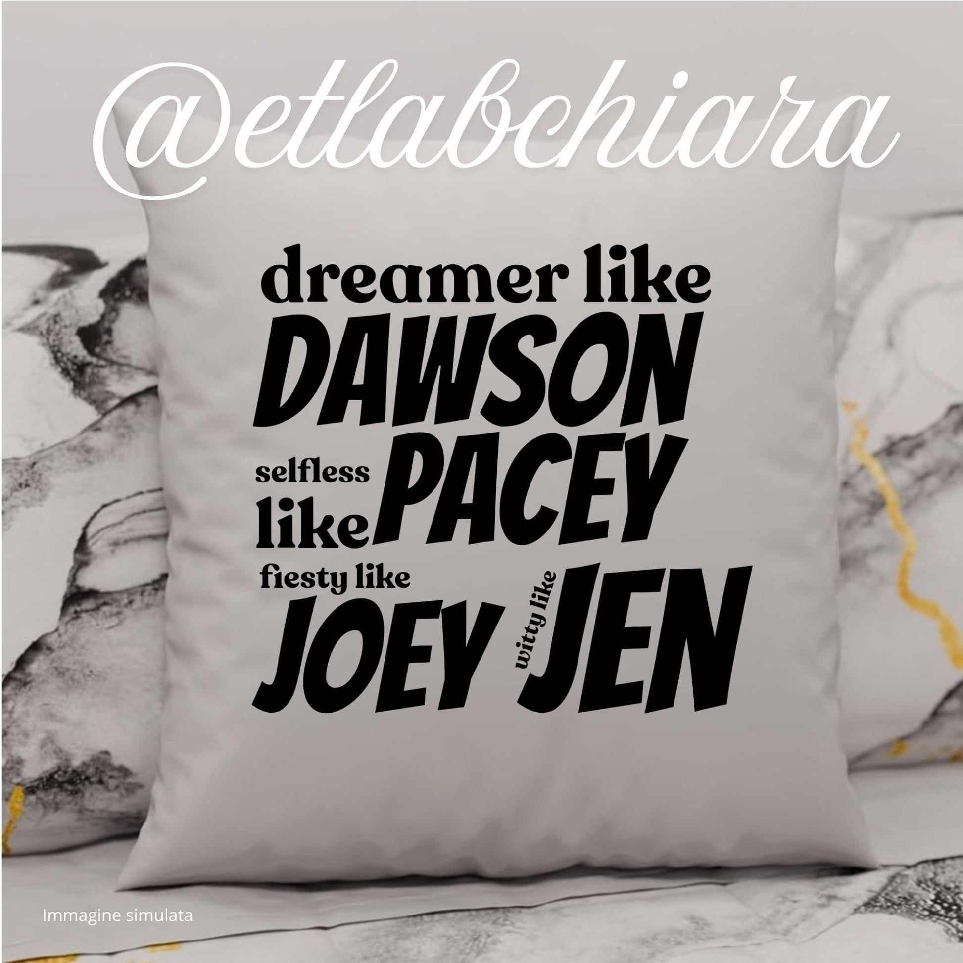 1 federa decorativa con stampa sublimata, 40x40cm, senza imbottitura. Federa in poliestere effetto velluto. Stampa liberamente ispirata ai personaggi della serie TV Dawson's Creek.