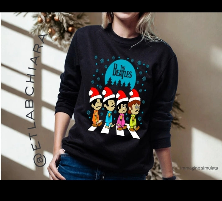 Felpa nera girocollo felpata internamente, grafica ispirata ai Beatles e alla famosa foto scattata in Abbey Road, versione natalizia. Leggere e controllare le misure nella tabella riportata nella seconda foto, questo tipo di felpa non è elastica.