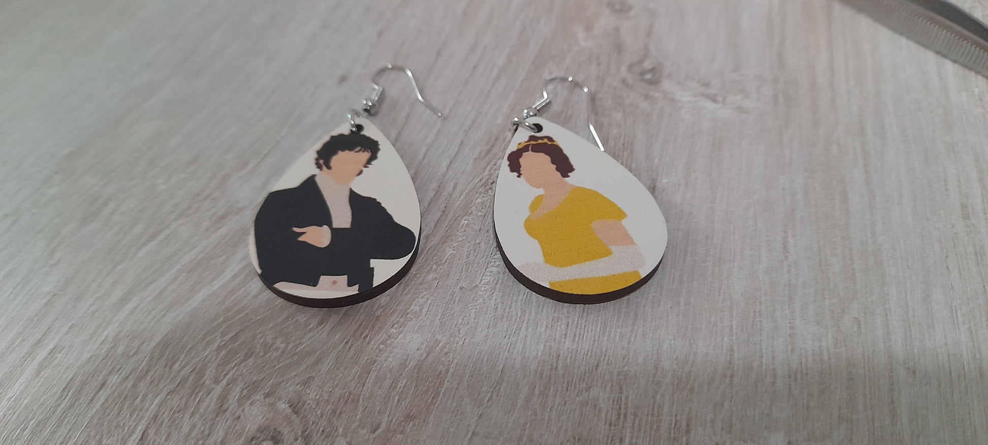 Orecchini in MDF (legno) con stampa sublimata fronte retro a tema personaggi di Orgoglio e Pregiudizio , Mr. Darcy e Lizzie Bennet, liberamente ispirati. Gancio anallergico.