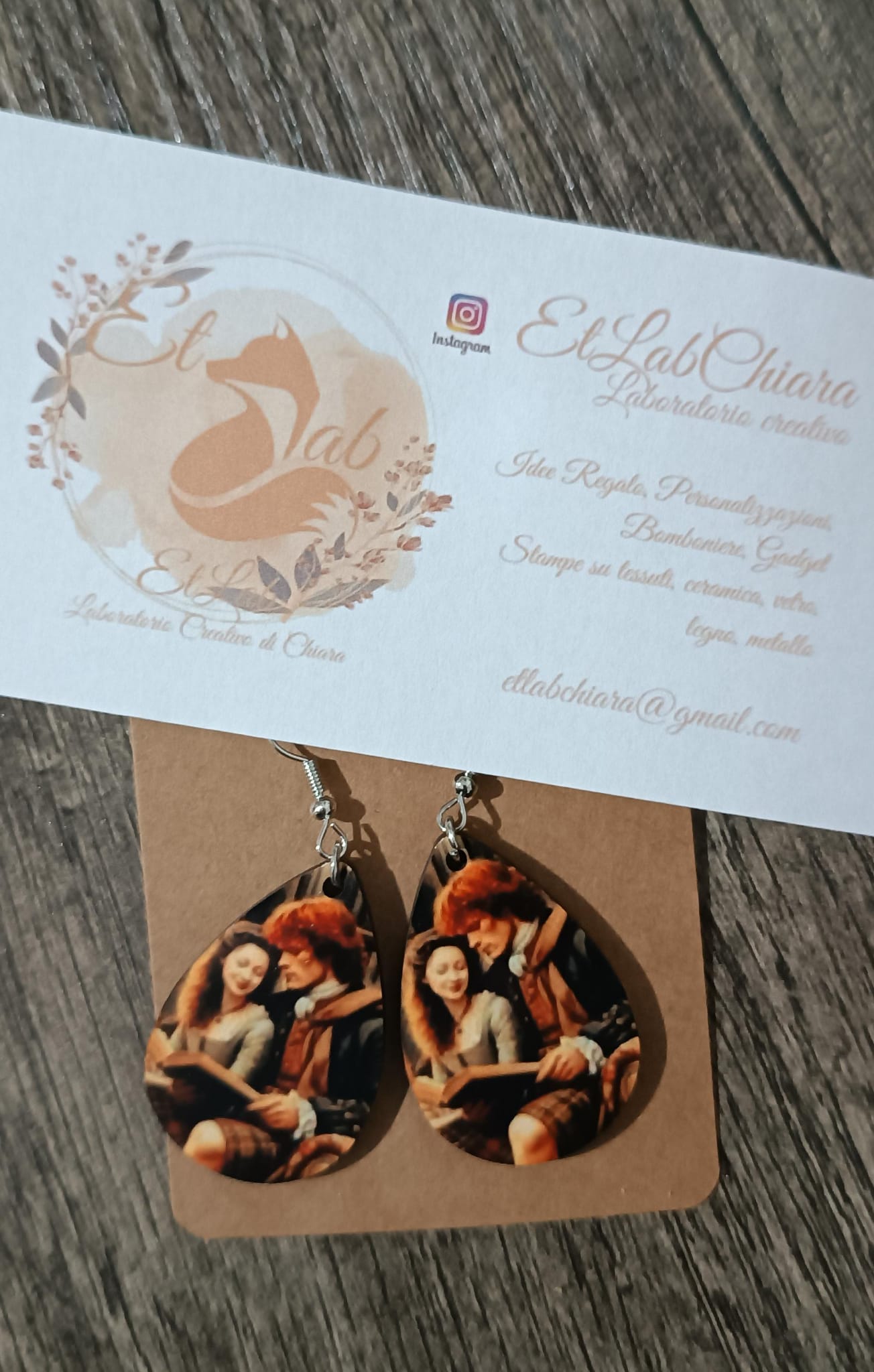 Orecchini in MDF (legno) con stampa sublimata fronte retro ispirata ai personaggi di Outlander, Claire e Jamie Fraser. Gancio anallergico.