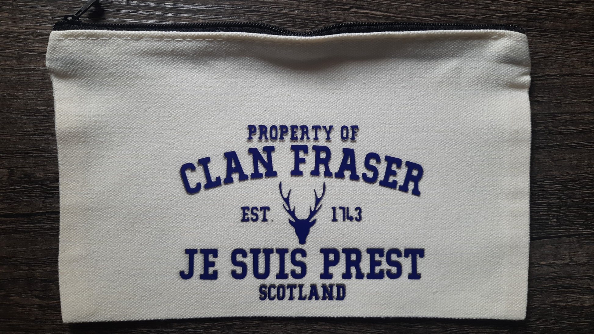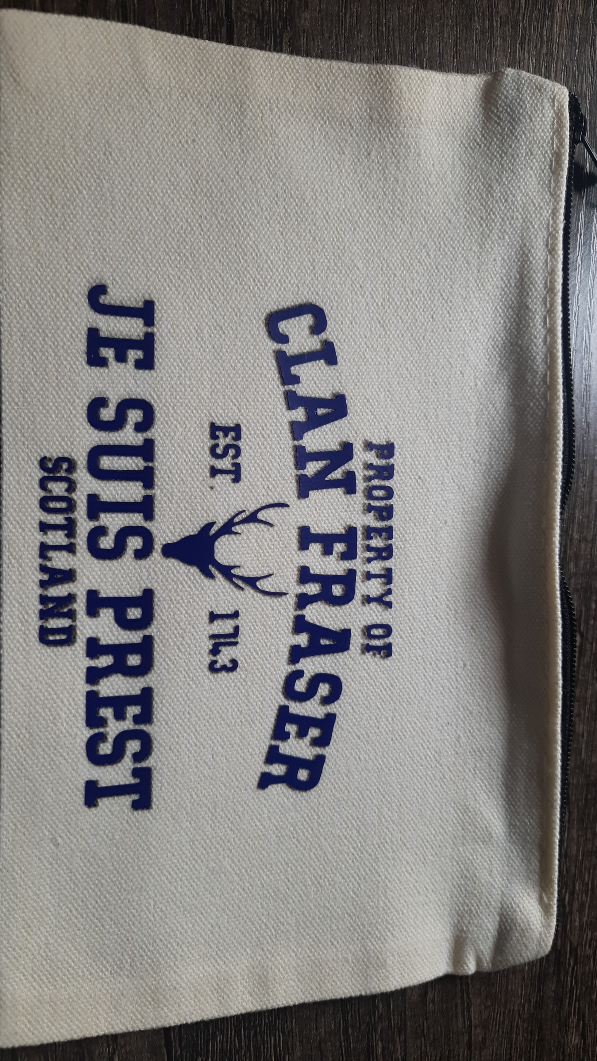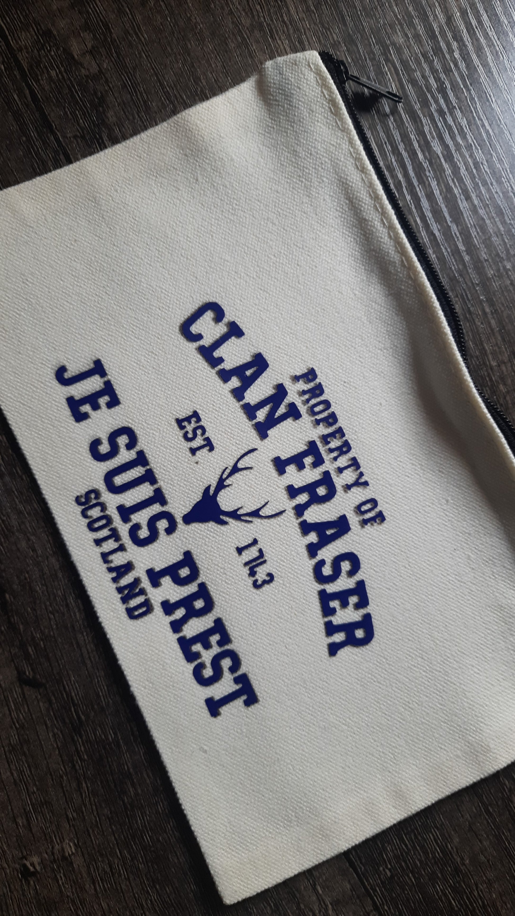 Pochette porta oggetti /porta trucco in tela color panna con scritta blu in vinile ispirata al Clan Fraser di Outlander! La scritta è disponibile in altri colori.