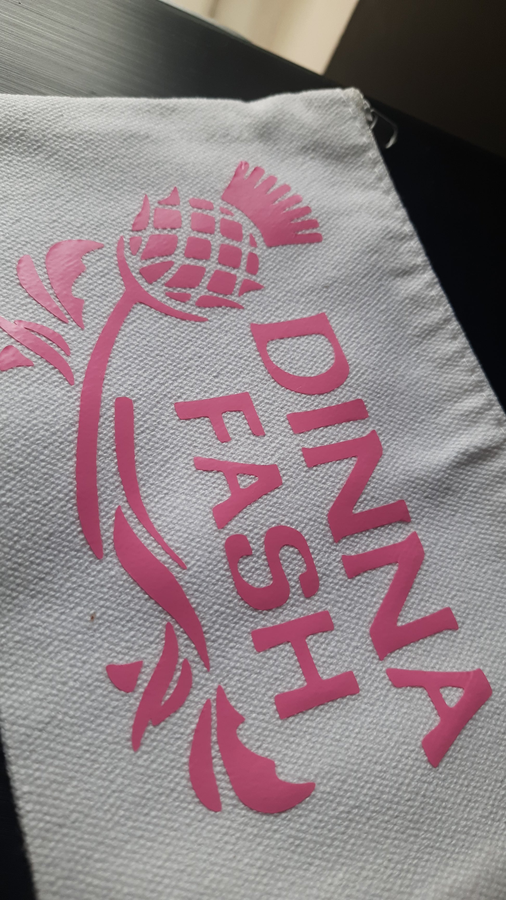 Pochette in tela color panna con grafica in vinile rosa "Dinna Fash" in Gaelico ispirata ad Outlander.
