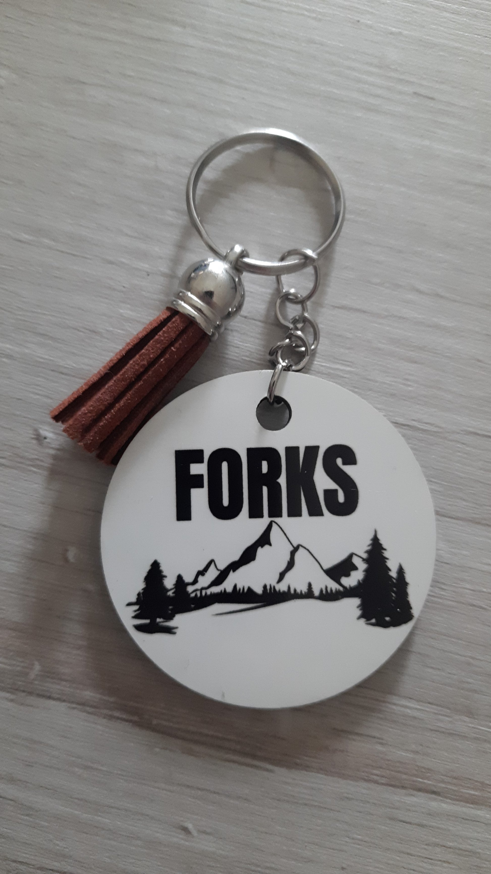 Portachiavi in MDF (legno) con stampa sublimata fronte-retro a tema FORKS ispirato alla serie Twilight Saga.