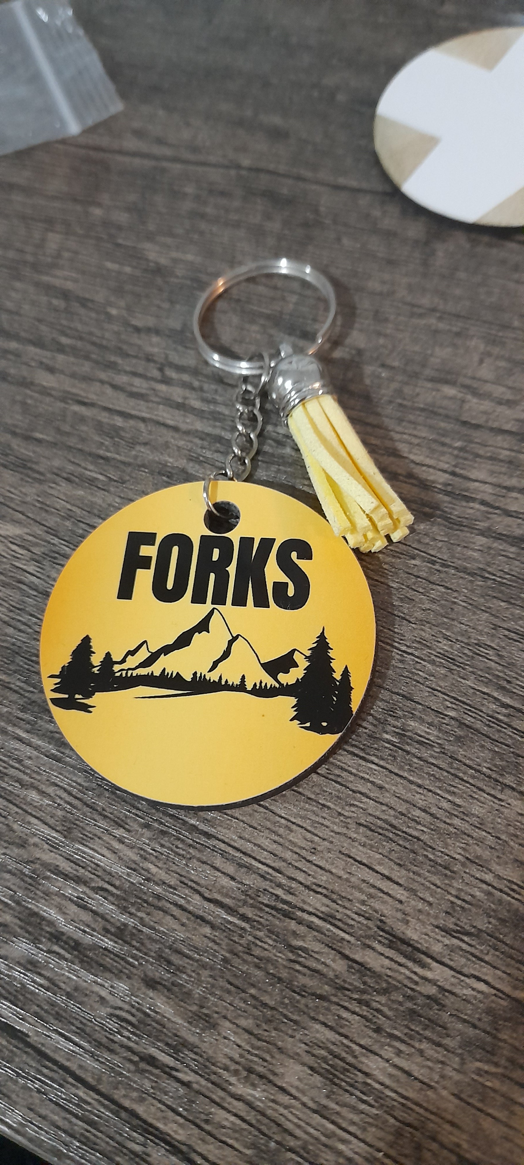 1 Portachiavi in MDF (legno) con stampa sublimata fronte retro come da foto ispirato alla cittadina di Forks (dalla Twilight Saga) con effetto dorato.