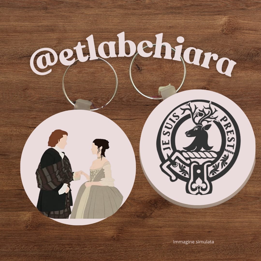 Un portachiavi in MDF (legno) con grafica sublimata fronte retro ispirata alla serie tv Outlander, sul fronte Jamie e Claire, sul retro lo stemma dei Fraser.
