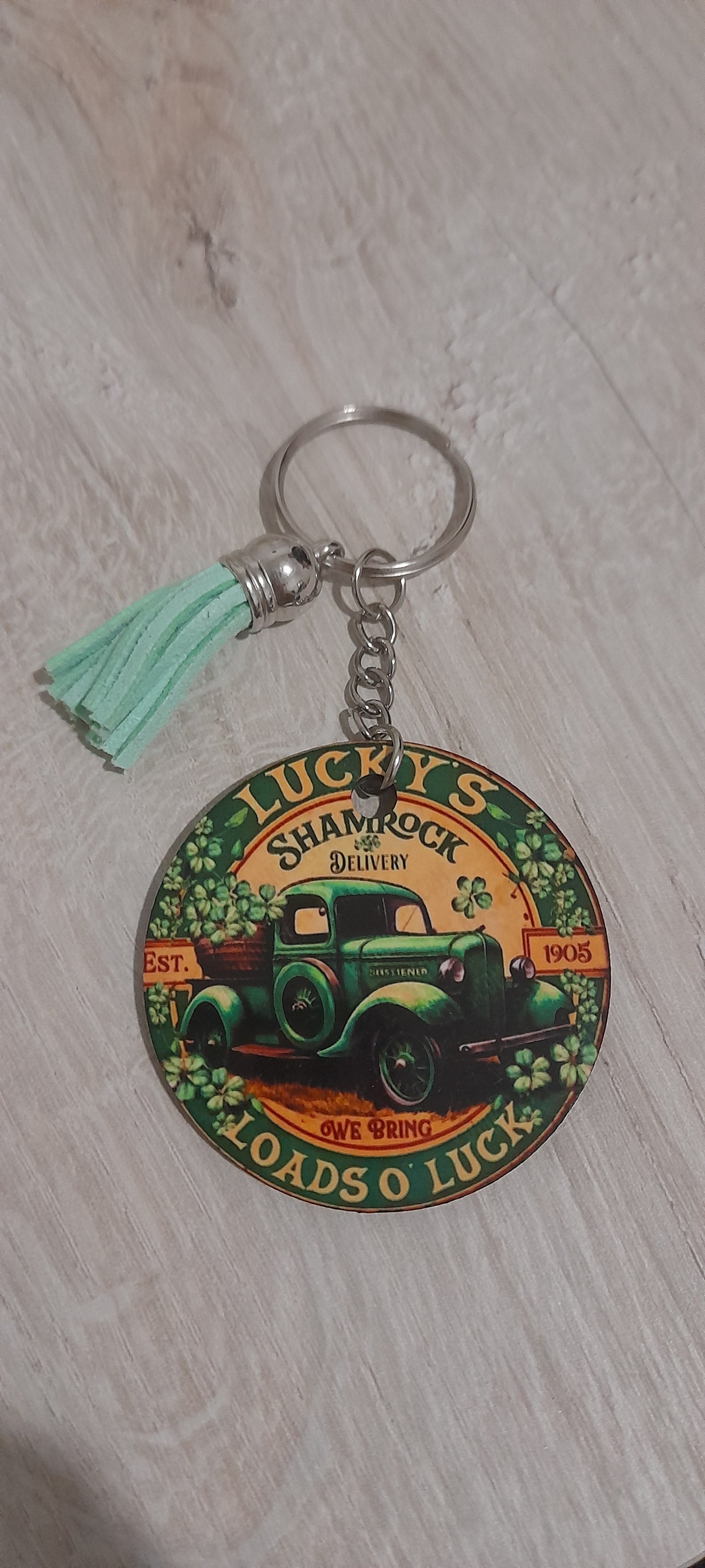 1 Portachiavi portafortuna in MDF (legno) a tema Irlanda - San Patrizio con stampa sublimata fronte-retro come da foto.