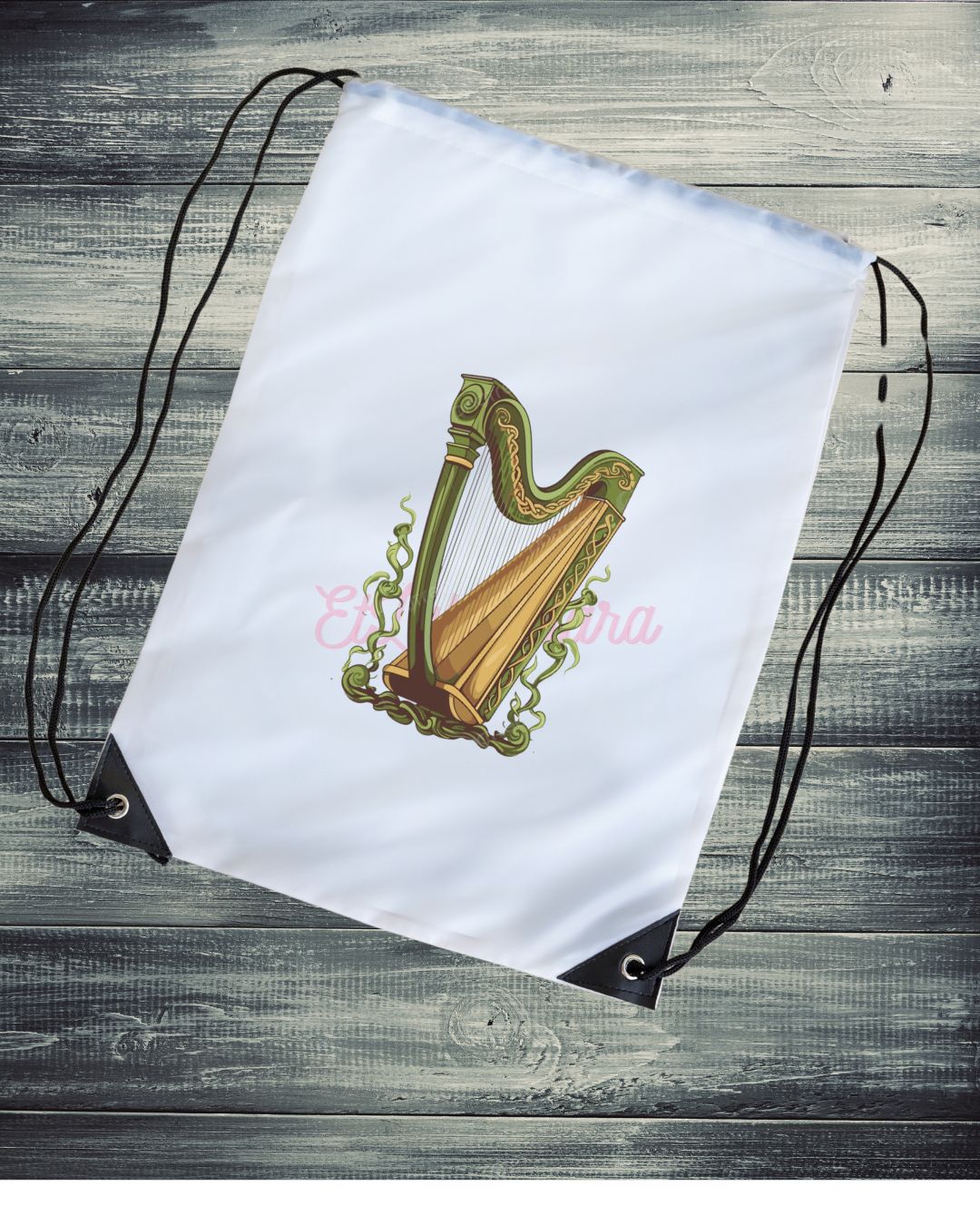 Sacca in poliestere bianca con stampa sublimata a tema Arpa Celtica Irlandese, simbolo dell'Isola di Smeraldo.