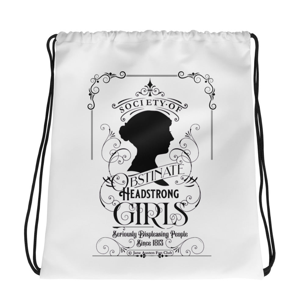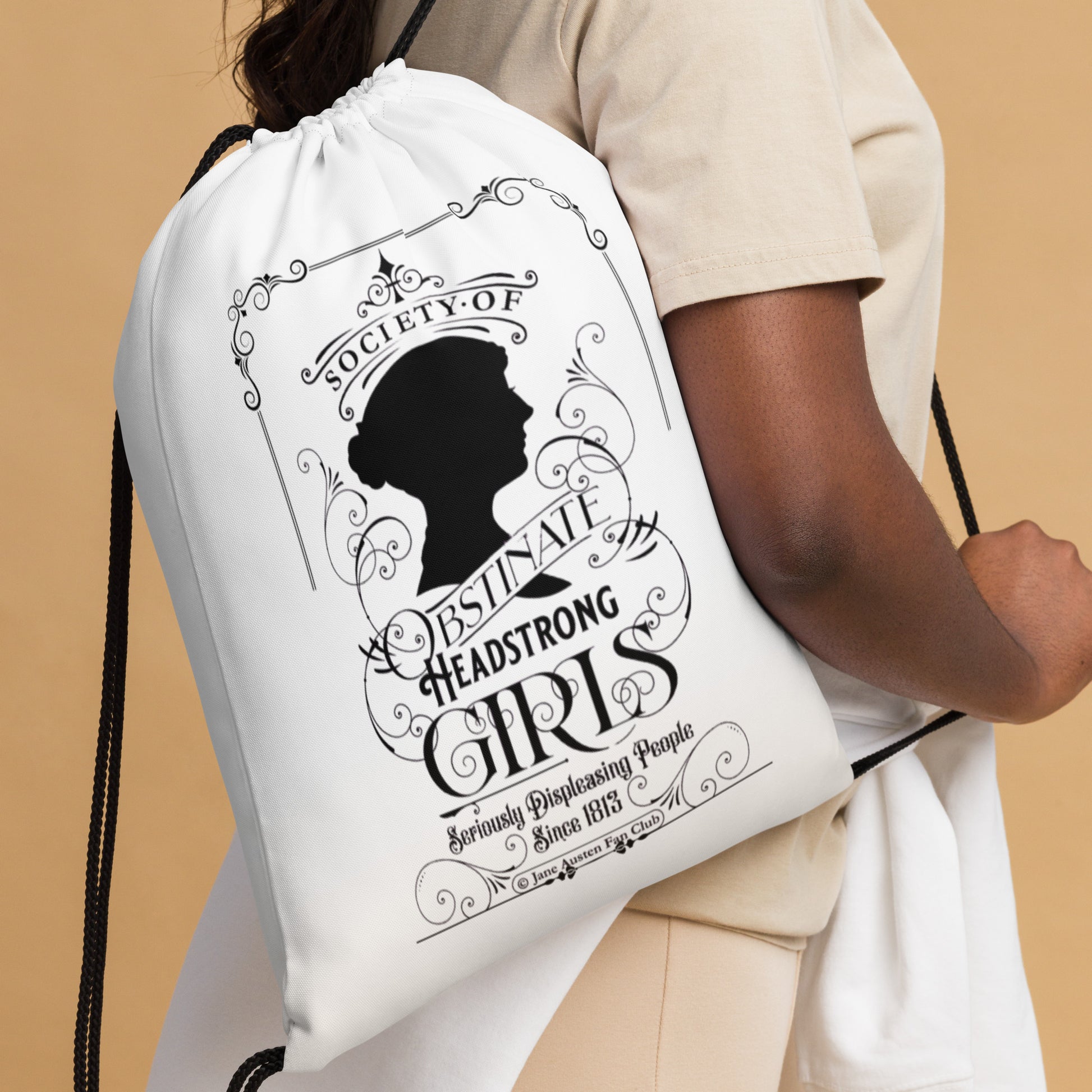 Sacca in poliestere bianca con stampa sublimata ispirata a Jane Austen.