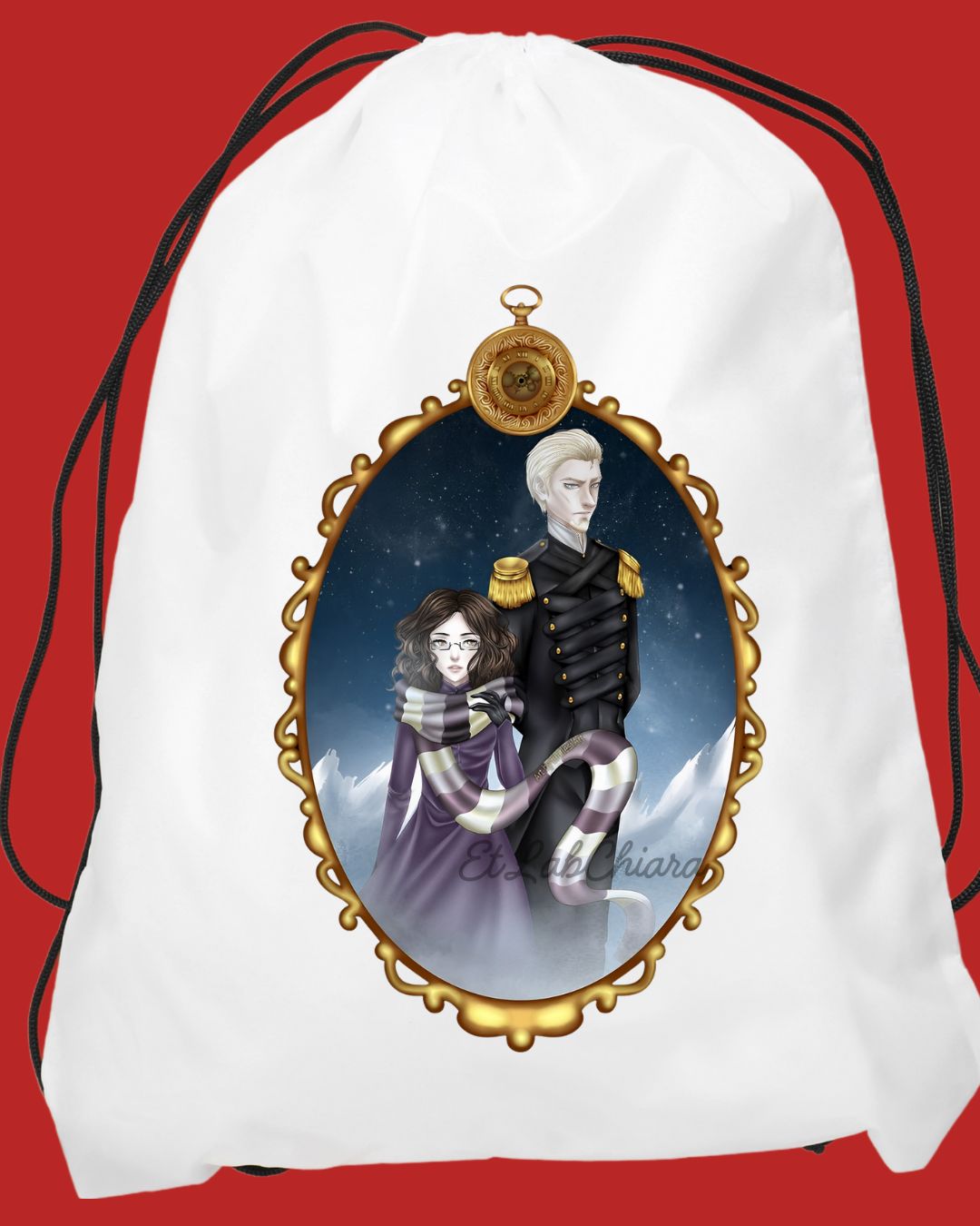 Sacca in poliestere bianca con stampa sublimata solo sul fronte a tema L'attraversaspecchi.