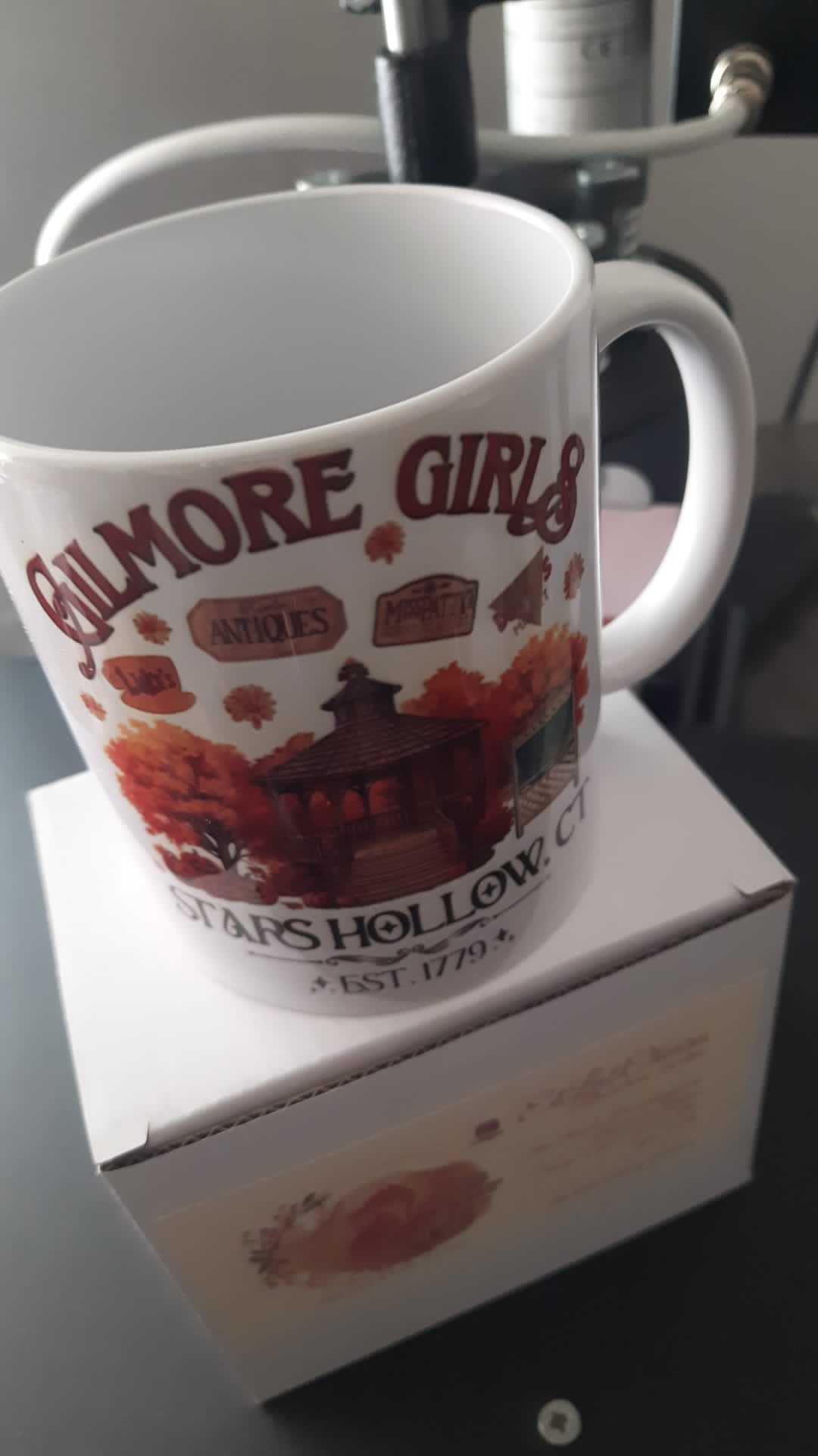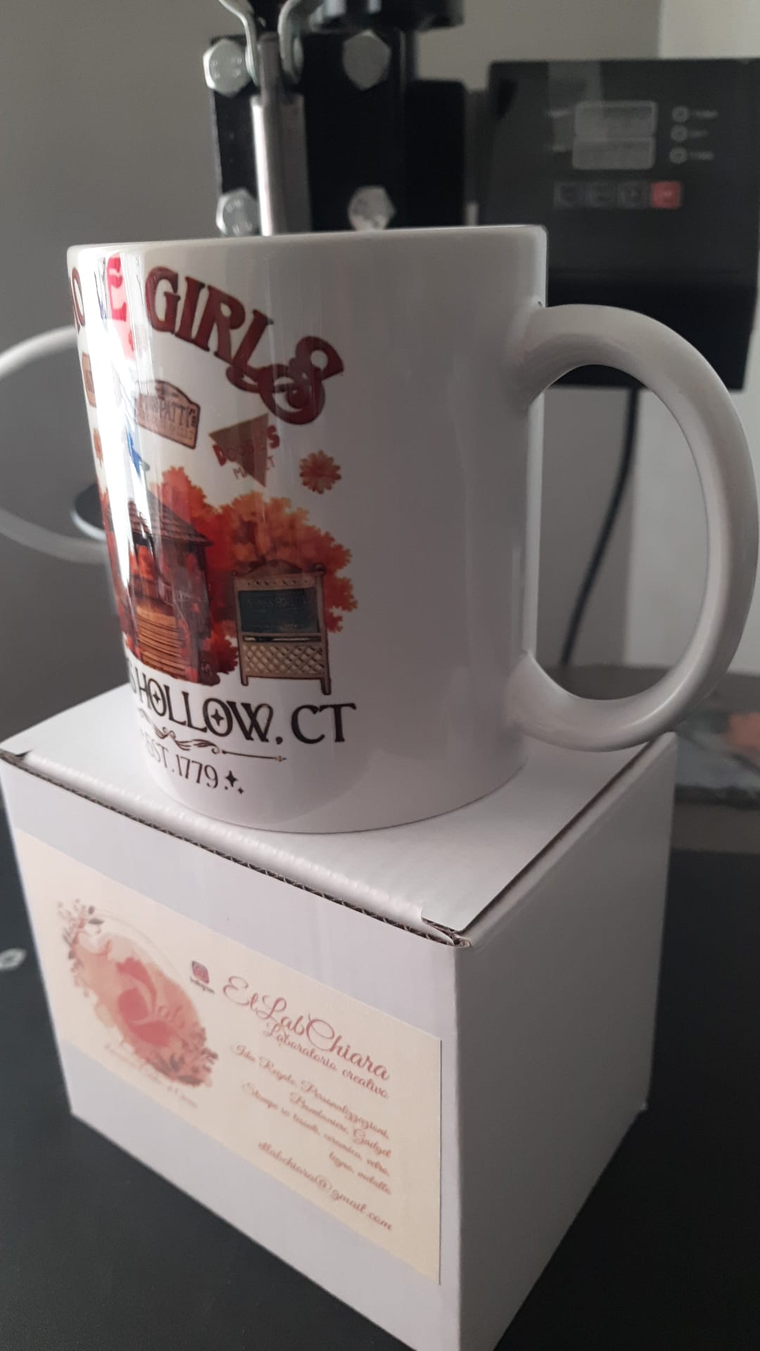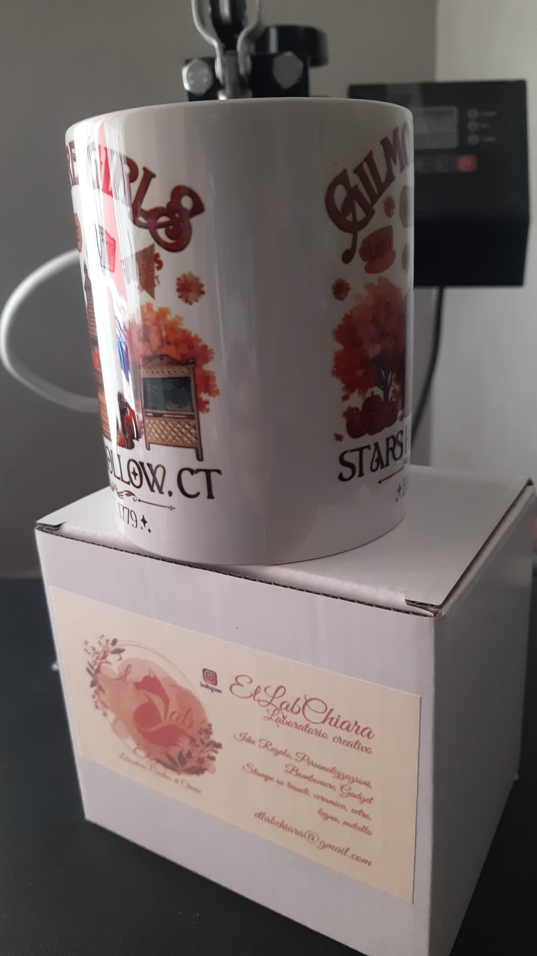 Tazza in ceramica bianca da 350ml con stampa sublimata a tema Stars Hollow in versione autunnale (ispirata al villaggio della serie tv Gilmore Girls).