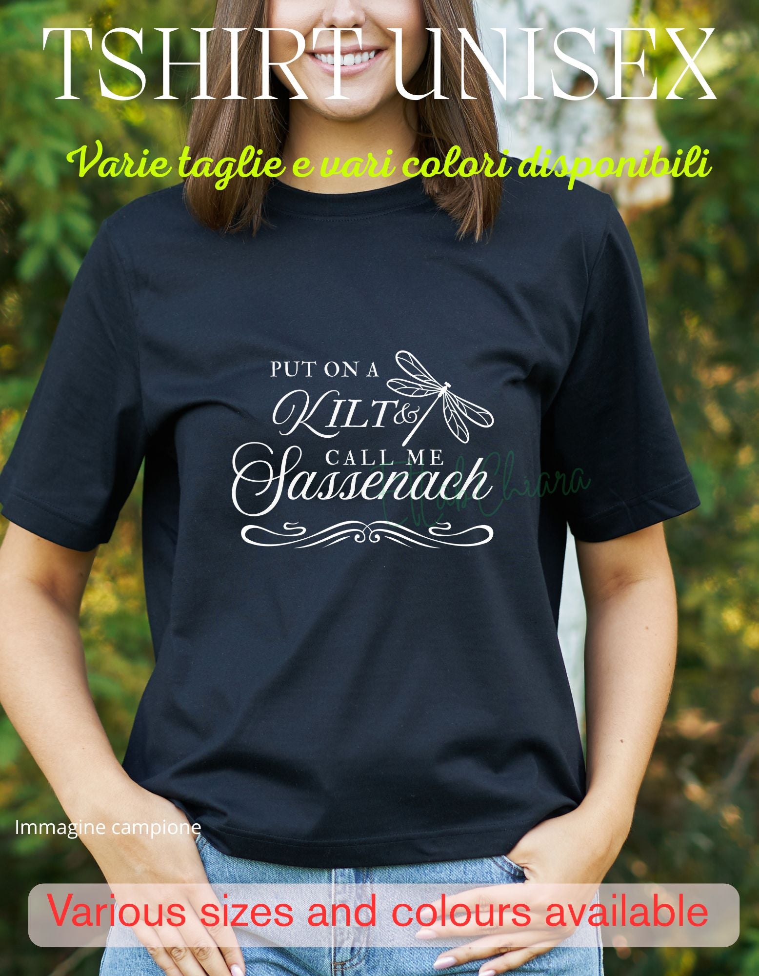 T-shirt blu maniche corte unisex (non sancrata) 100% cotone con grafica in vinile della frase "Put on a kilt and call me Sassenach" ispirata alla serie tv Outlander. Disponibile in varie taglie.