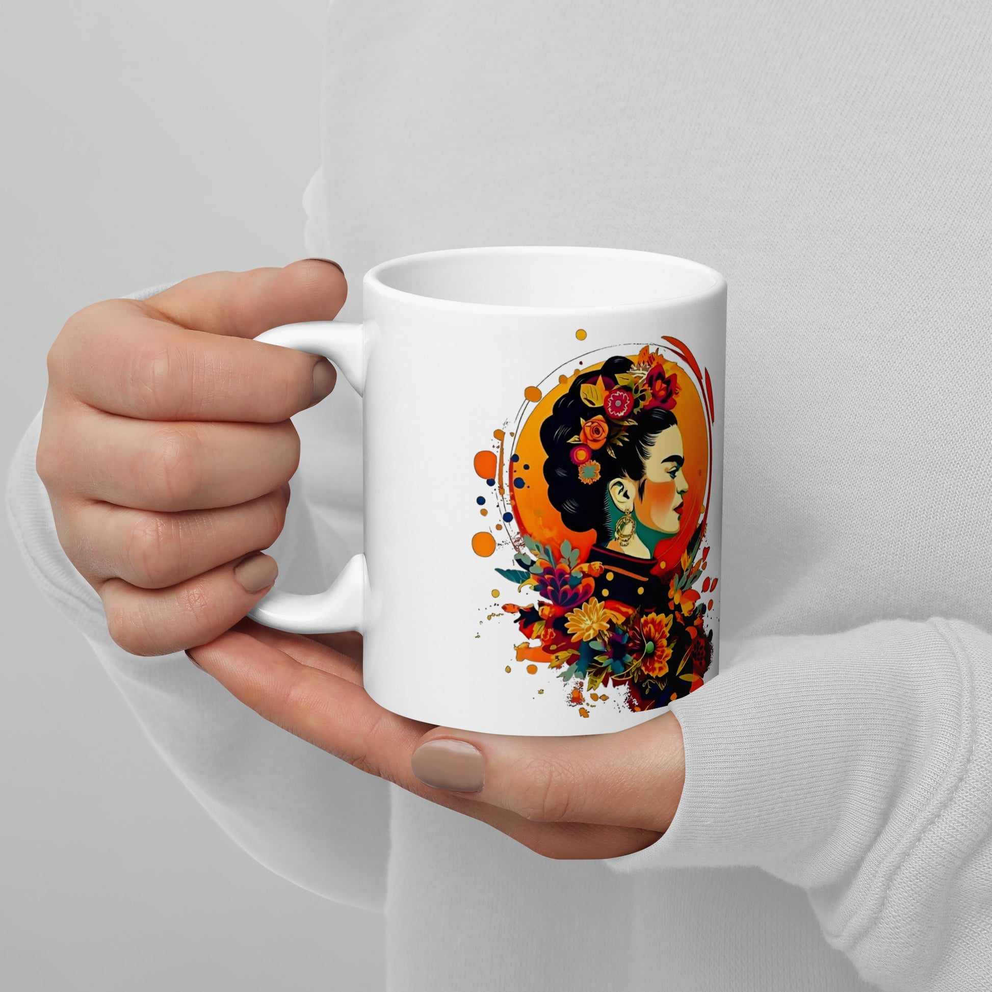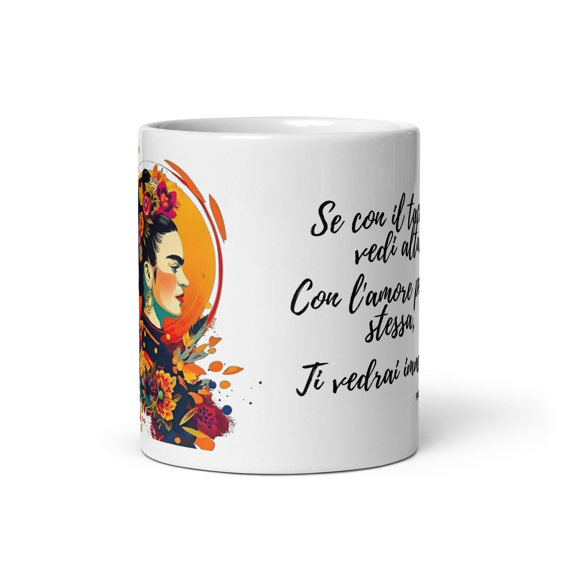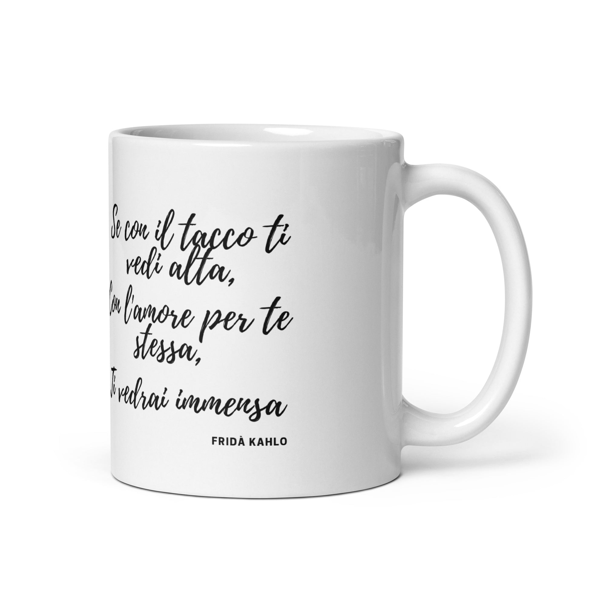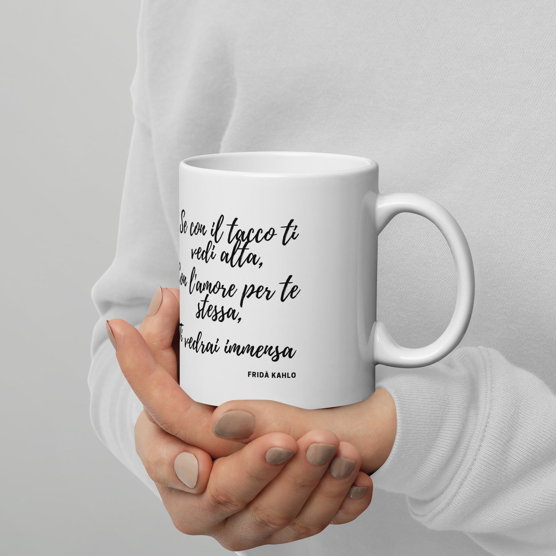 Tazza in ceramica con stampa sublimata ispirata a Frida Kahlo con frase in italiano: "Se con il tacco ti vedi alta, con l'amore per te stessa, ti vedrai immensa".