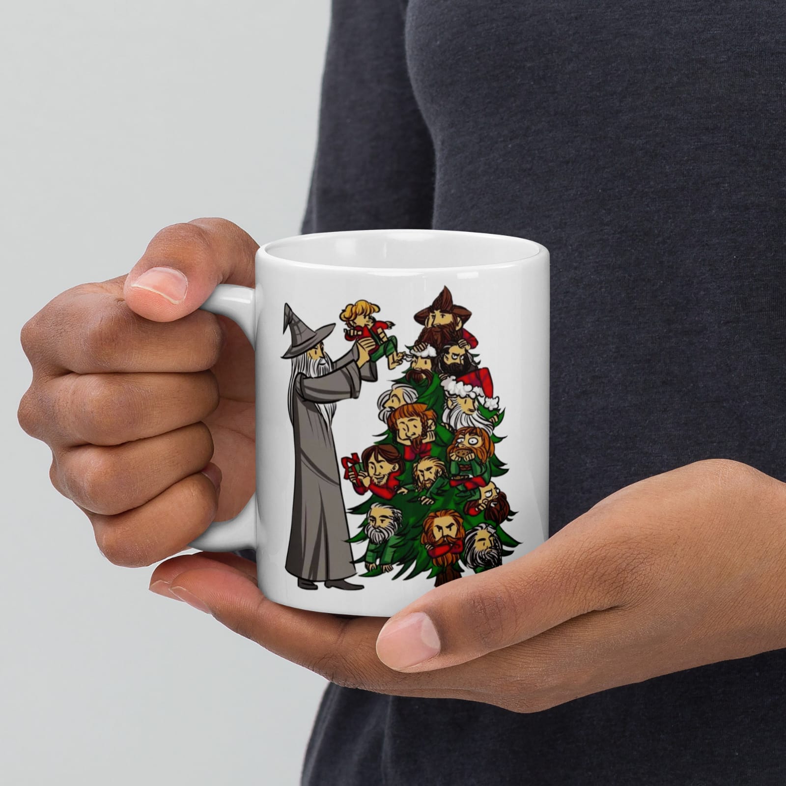 1 Tazza in ceramica con stampa sublimata liberamente ispirata ai personaggi de "Il Signore degli Anelli" con Gandalf e altri personaggi, a tema natalizio. La tazza può andare in lavastoviglie e in microonde.
