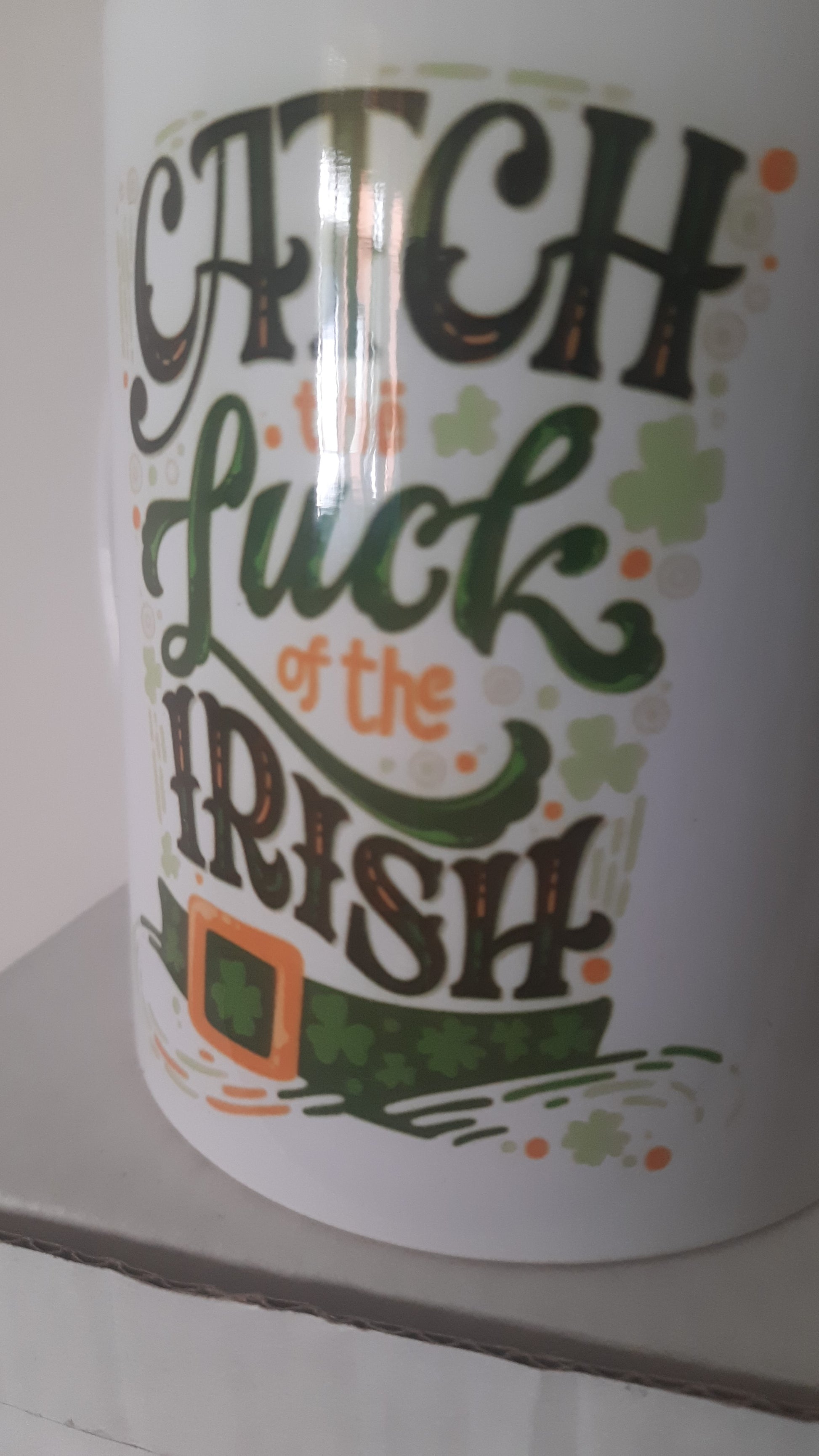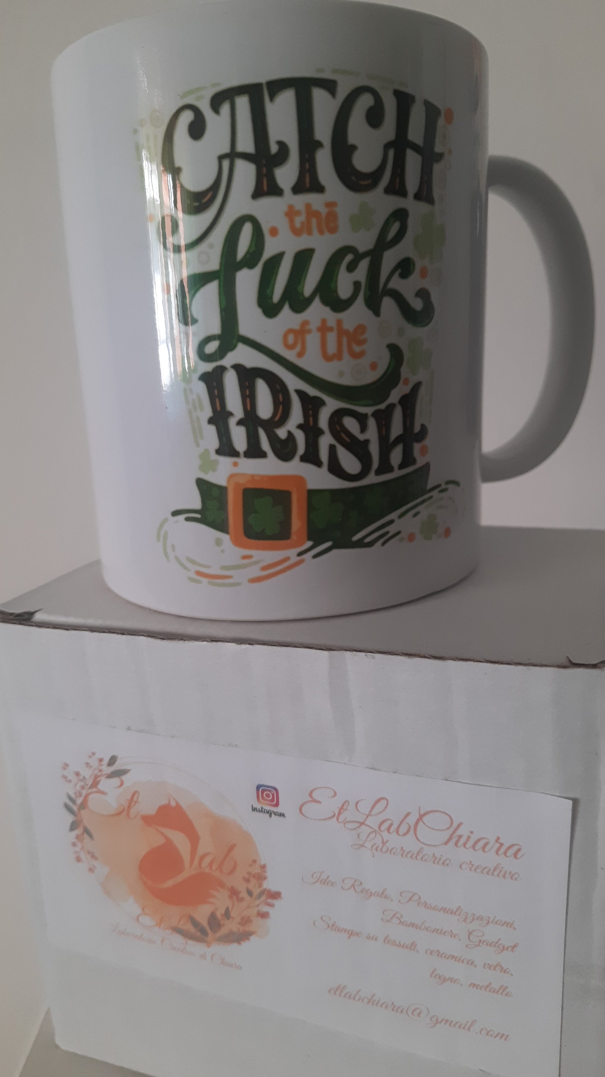 Tazza in ceramica bianca con stampa "Catch the Luck of the Irish". Può andare in microonde e lavastoviglie. Capienza 350 ml.