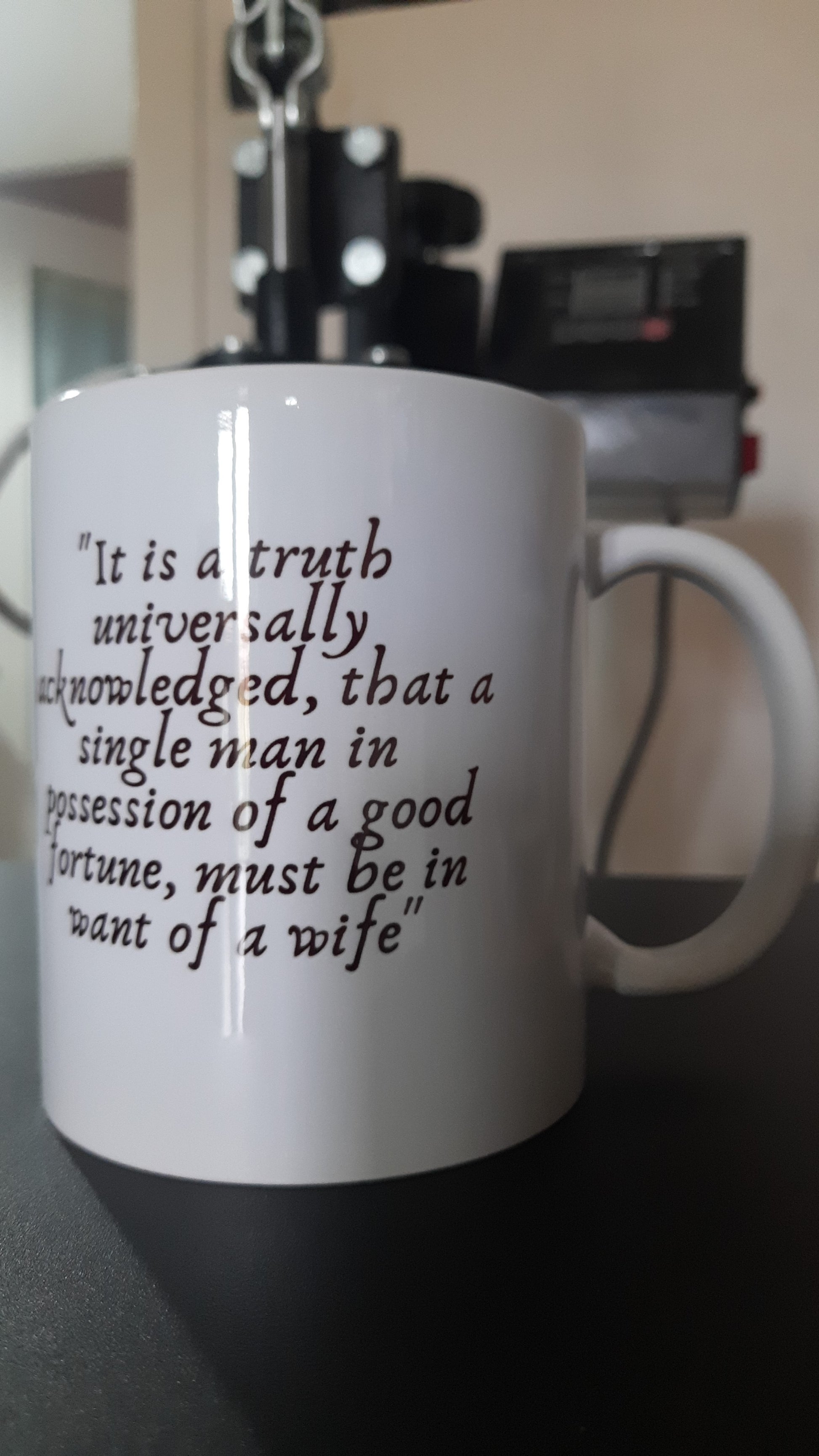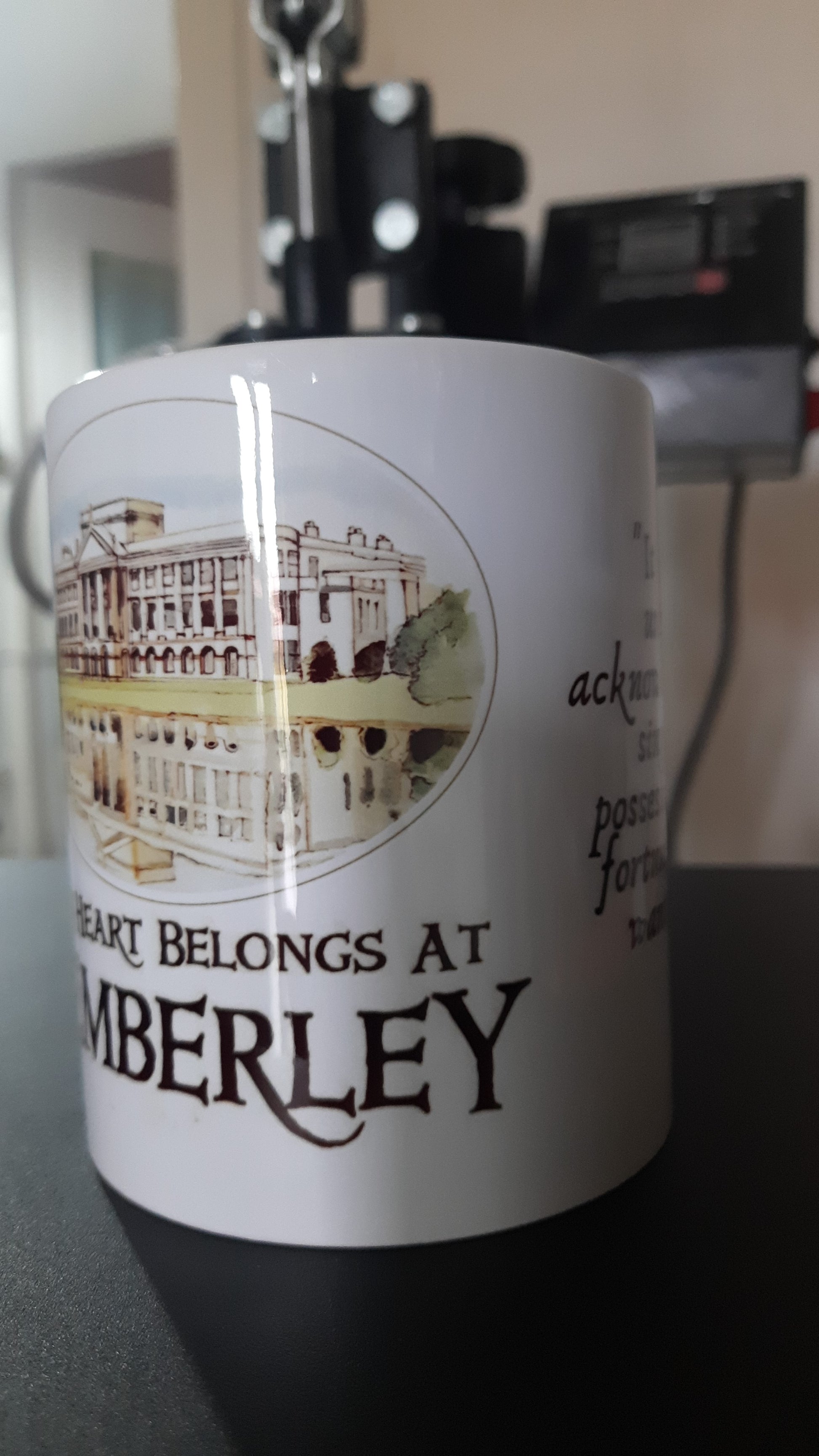 Tazza in ceramica bianca con stampa sublimata a tema Orgoglio e Pregiudizio di Jane Austen, tenuta di Pemberley, La tazza può andare sia in lavastoviglie che in microonde.