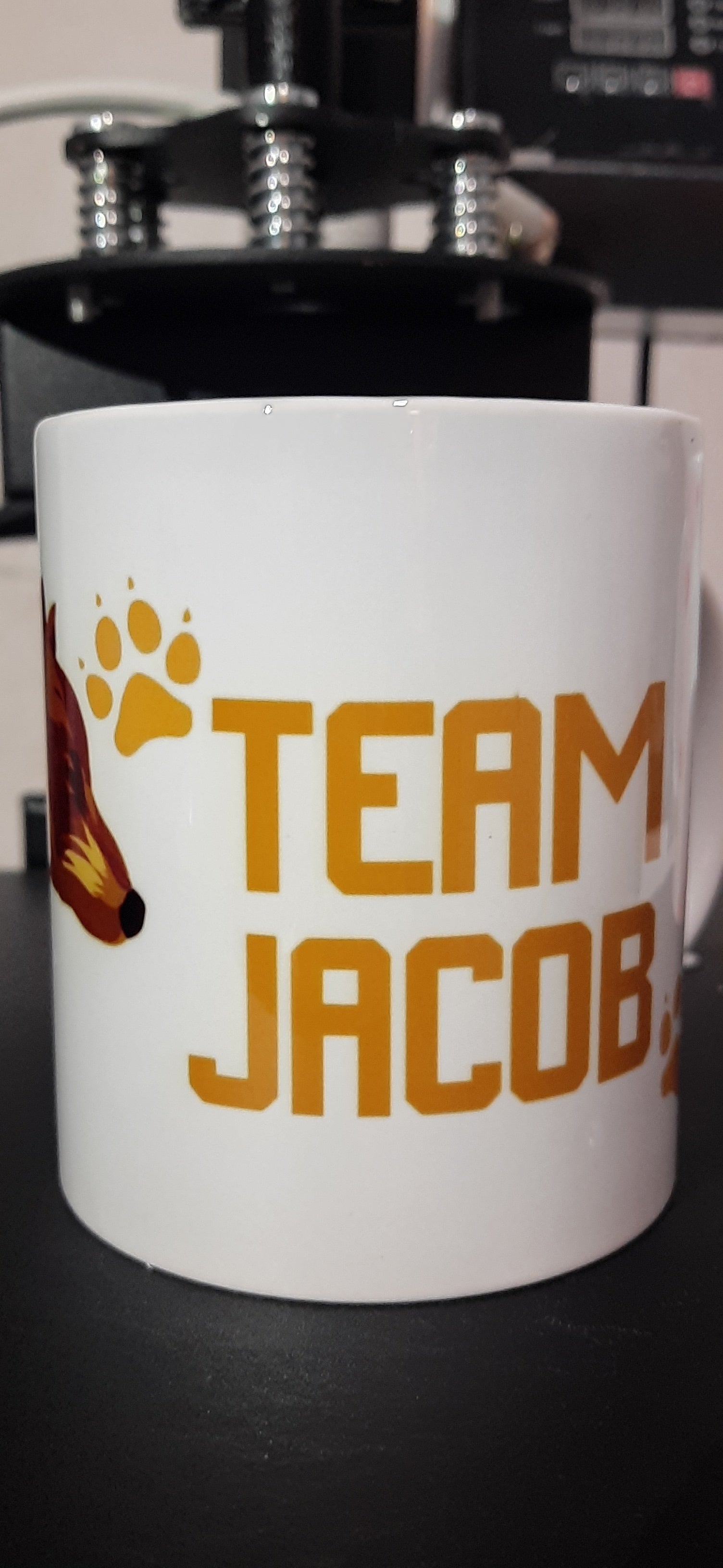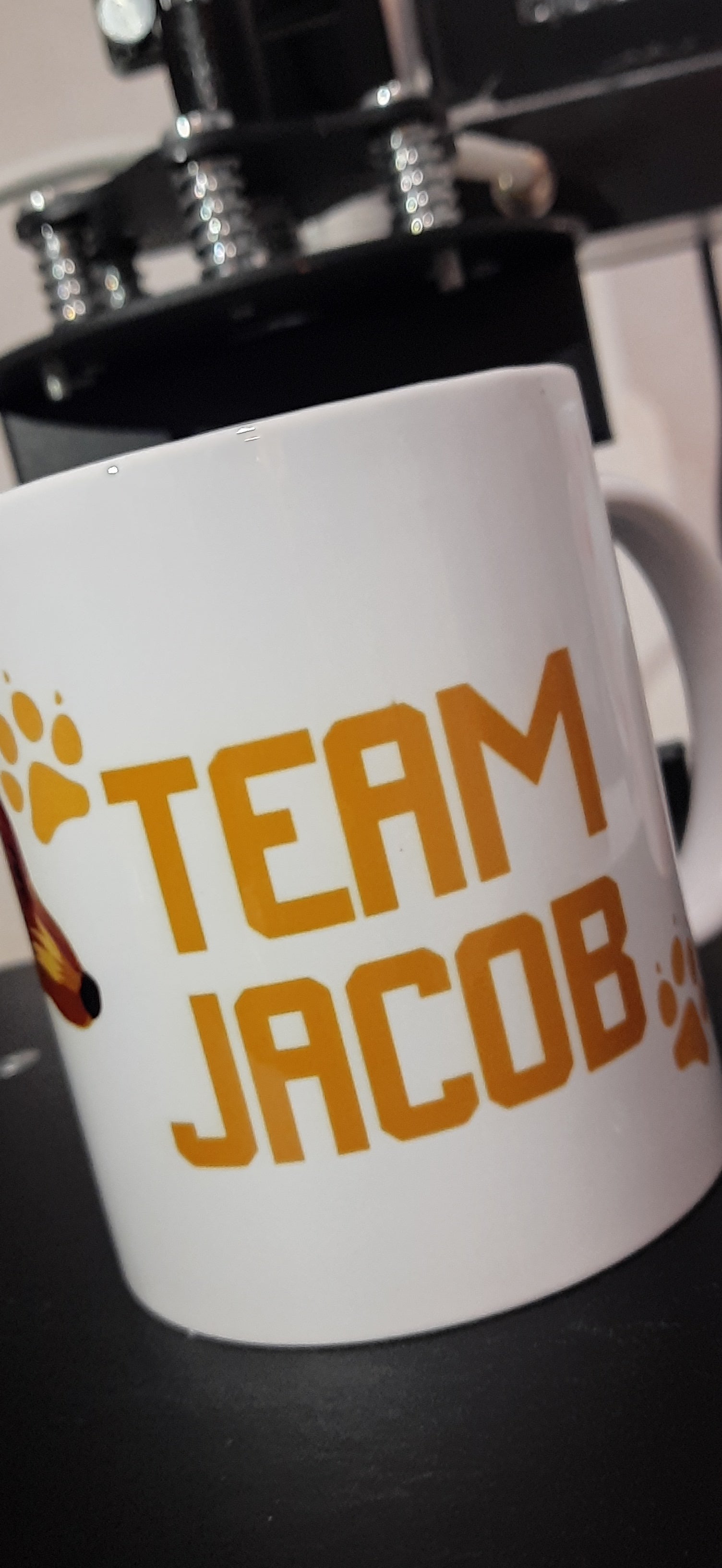 1 Tazza in ceramica da 350ml con stampa sublimata a tema Twilight Saga, con i disegni di Bella Swan e Jacob Black(versione lupo) e la scritta TEAM JACOB.