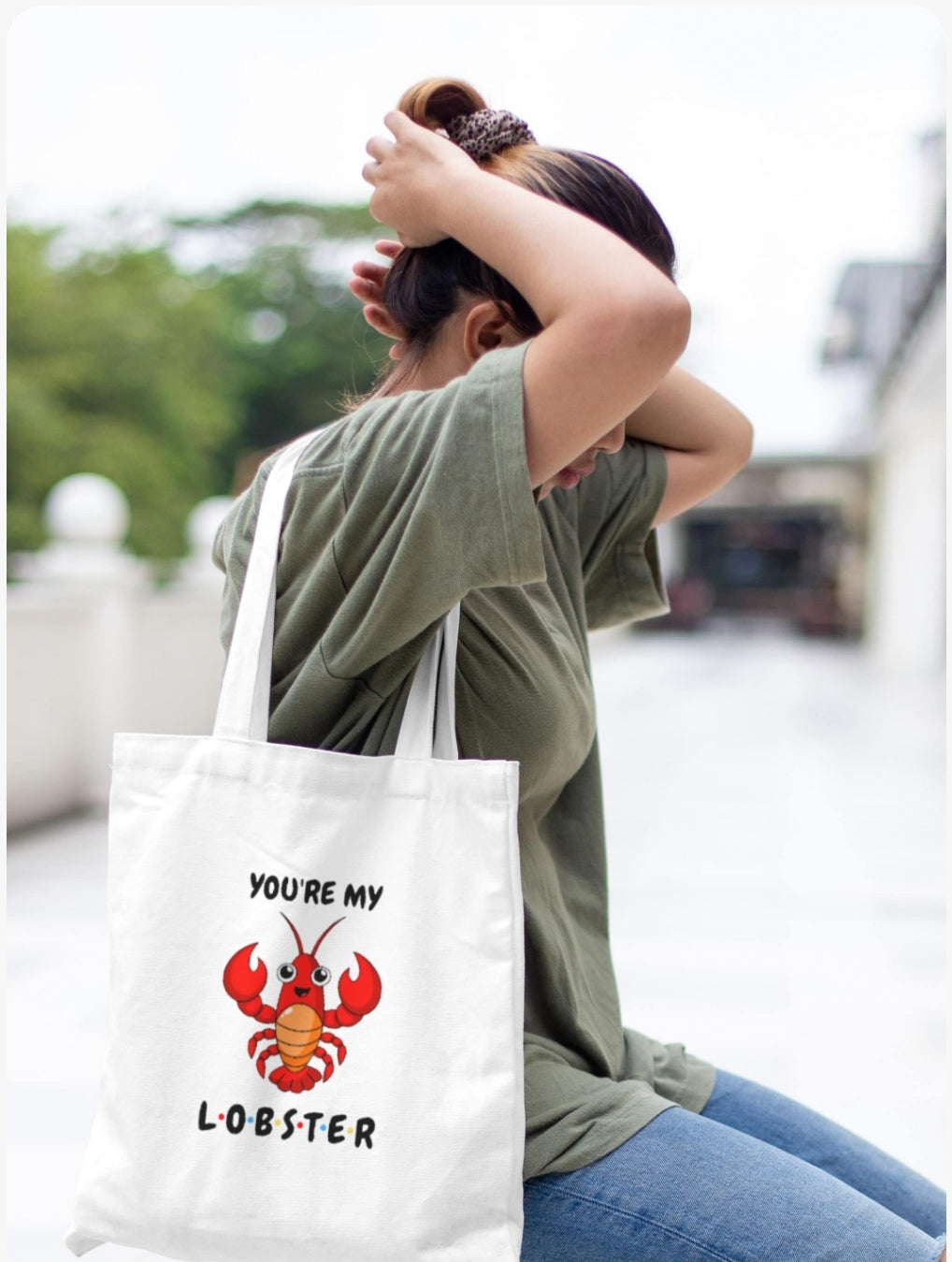 Tote Bag in cotone con stampa sublimata ispirata alla serie tv FRIENDS con frase "You're my lobster". Stampa solo su un lato.